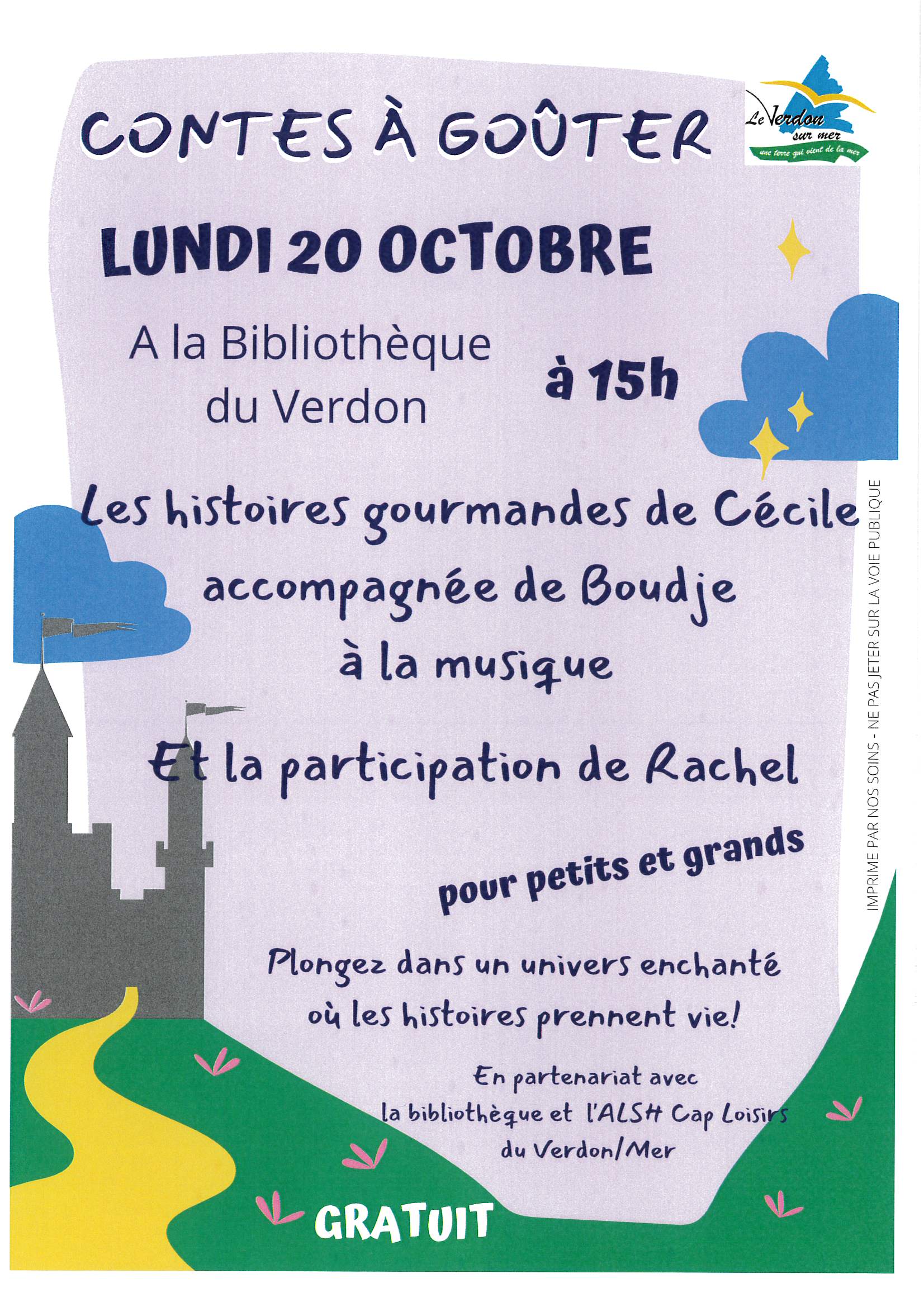 ![]() à la bibliothèque à 15 h. "les histoires gourmandes de Cécile accompagnée de Boudje à la musique" et la participation de Rachel. Pour petits et grands. Gratuit. En partenariat avec la bibliothèque et l'Alsh cap-Loisirs du Verdon sur Mer. |